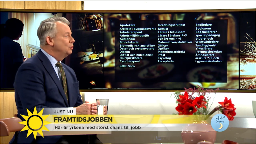 Nu har SACO:s årliga framtidsprognos kommit. Göran Arrius, ordförande SACO, Sveriges akademikers centralorganisation, berättar inom vilka yrkesgrupper det kommer finna jobb i framtiden.